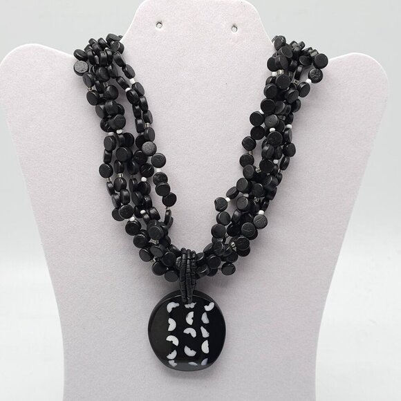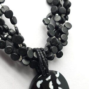 Black Multi-Strand Wood Bead Necklace Shell-Inlaid Pendant By Chicos