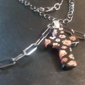 Elegant 16 in long floral cross pendant necklace with a black and colorful design. Perfect for adding a touch of style to any outfit. will work with extender