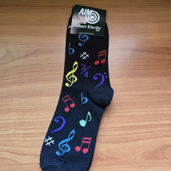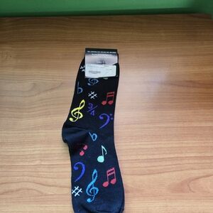 Step up your style with black socks featuring colorful musical notes. Perfect for music lovers.