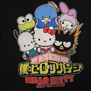 Black t-shirt featuring My Hero Academia and Hello Kitty characters. Vibrant graphic design.