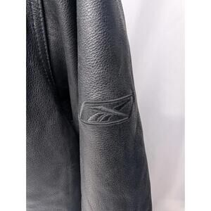The product is a black Reebok leather jacket officially licensed by the National Football League (NFL), featuring the Denver Broncos team logo. This unisex adult jacket in size M is perfect for fans of the team, specifically designed for the regular season. With a nod to a significant event like the Super Bowl XXXIII, this jacket is a stylish and practical way to show support for the Denver Broncos and the NFL in general.