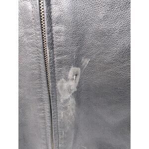 There is a significant scuff and a hole in the front of the jacket. It looks like road rash, and it goes all the way through the layer of leather on the front to the lining on the inside.