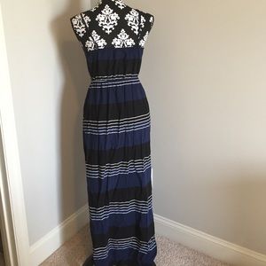 Black & Navy Hi Low Striped Dress ๐ Size S ๐ Adjustable Spaghetti Straps ๐ Slit on each side ๐ Hem is curved and longer in the back than front ๐ Elastic at empire waist ๐ Worn twice, perfect condition!