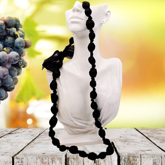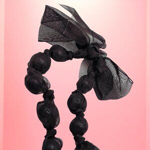 Beautiful pre-owned black netted-bead necklace featuring medium-weight wrapped beads and a soft ribbon-tie closure. Stylish, lightweight, and perfect for layering or adding bold texture to any outfit.