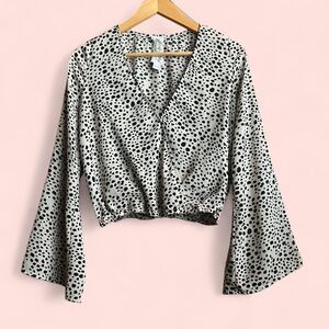 Black & Neutral Grayish-White Dalmatian/scattered Leopard Print Blouse W/ Flared Bell Sleeves & Faux Wrap Bust. Gently used and honestly, no callouts (I really liked this blouse). Somewhat of a plunge neckline, please be aware of potential cleavage showing due to this. Elastic waist. Cropped. Looks so cute with black high waisted jeans !