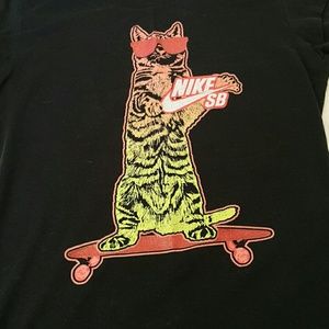 A black Nike sb shirt with a skateboarding cat. This shirt is medium worn but it's still in pretty good condition. The cat is ombre with green and red-ish orange. Pretty cute shirt and could have multiple purposes. There are no tears or stains it's 60% cotton and 40% Polyester. Price is negotiable