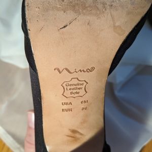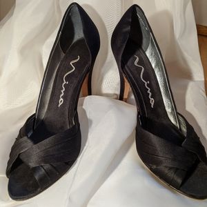 Black satin pumps. Heels are 3 3/4 inches. Beautiful detail on the toe.