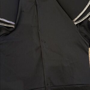 Black ninja costume featuring a red emblem. Includes hood and silver accents. There is only one leg tie but may be long enough to cut to make a second. The belt is included but the star that attaches to the belt is missing. Photo of belt shows where star would attach. Youth Medium