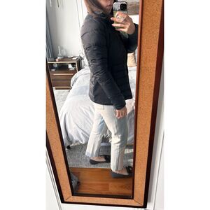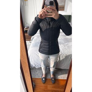 A perfect puffer winter jacket. Warm but not too bulky. Super soft too. Great for outdoor activities like running or hiking or even just on the way to a workout class. Note that the lettering has come off, hence the price.