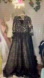 Dramatic black lace wedding gown with nude underlay, perfect for the bold, unlike-anyone bride. This unbranded gem features a sheer illusion bodice with lace sleeves and a full flowing skirt. The back corset tie allows adjustability. Scattered beading adds depth and just the right amount of glam!