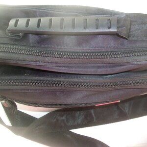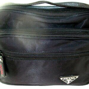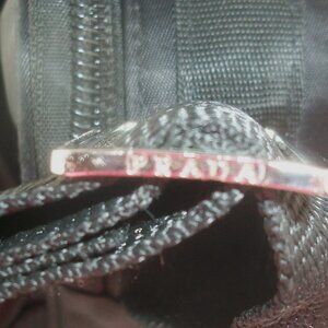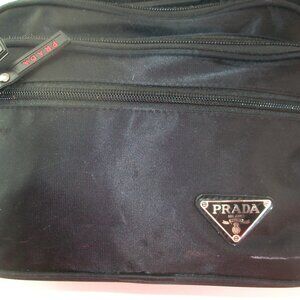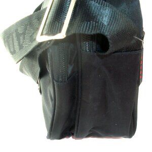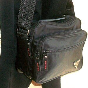 A black nyion convertible crossbody bag with 4 lined zippered compartments - the largest one with a zippered pocket inside -- rubber top-handle and long broad adjustable black strap.  With 4 black rubber zip pulls - 3 on the side and 1 in the rear - with red name on each one and engraved name on metal  strap-adjuster.  In very good condition with 1 mark on the front near the "logo."  NOT Prada.  NOT LInea Rossa.  Dimensions are H 7"W 9" D 3.75" Strap drop at longest 22"