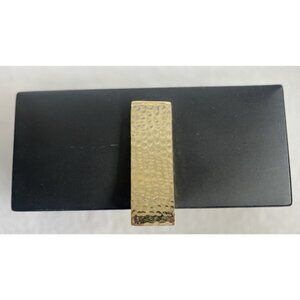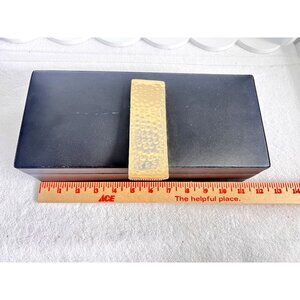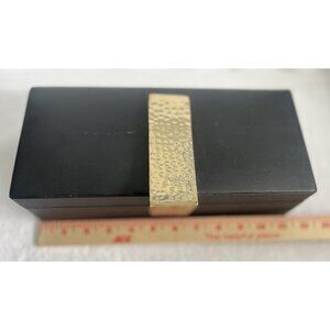 This black oblong faux leather hinged box with a hammered gold metal latch is a stylish and durable storage solution for electronics, jewelry, and other small items.