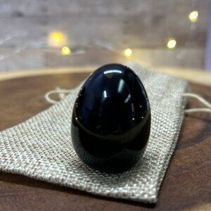 Black Obsidian Crystal Egg showcases elegant design and powerful grounding energies. Comes with a wooden stand and burlap pouch for easy display and storage.