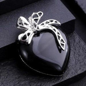 Black Obsidian Natural Gemstone Love Heart Bow Knot Pendant Necklace Gemstone