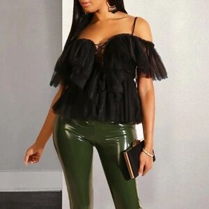 Black Off the Shoulder Lace Up Tulle Layered Blouse Size Small
