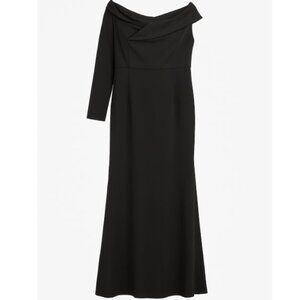 Bring drama (the good kind) to your next formal event in this sleek black off-shoulder gown. With its draped neckline, one-sleeve silhouette, and full-length design, this dress is made for special occasions. Elegant, flattering, and timeless — you’ll be the star of the night.