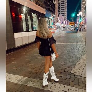 Stylish black off-shoulder top with ruffle details and ruffled skort. Perfect for a night out, a concert, a vacation, etc.