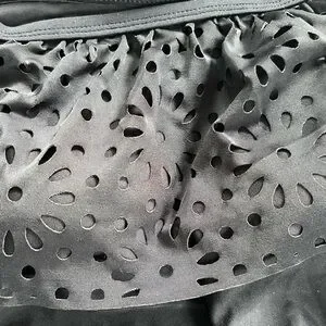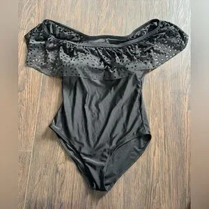 Stylish off-shoulder swimsuit. Ruffled laser-cut overlay on the shoulder. Smooth black body with a sleek fit. Modern and chic swimwear piece. Has padding.