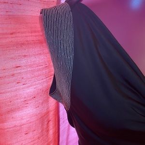 This one shoulder top is super cute dress it or just wear it with a cute pair of jeans. Beaded detail on one side and flowing sleeve on other side. Size medium this is considered a JR brand but does have a bit of stretch to it! Meant to cover your booty a bit on the longer side. NEW never worn. (Tags were taken off) bundle for discount. Comment with questions
