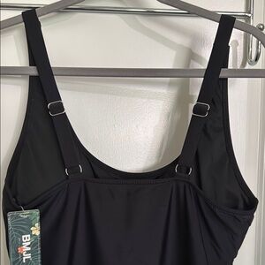 Elegant black one-piece swimsuit. Perfect for a sleek look at the beach or pool.