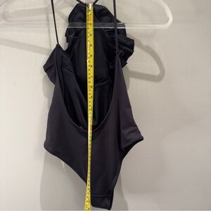 Elegant black one-piece swimsuit featuring a large floral accent. Perfect for a stylish beach day.