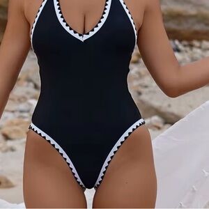 Stylish black one-piece swimsuit featuring white trim. Perfect for beach days.
