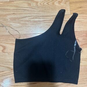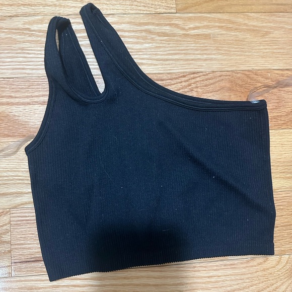 Elevate your style with this chic black one-shoulder ribbed top. Perfect for any occasion, it offers a sleek and modern look.