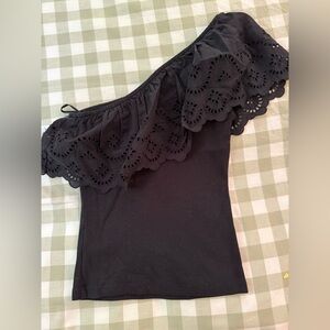 Stylish black one-shoulder top with ruffle detail. Perfect for any occasion.