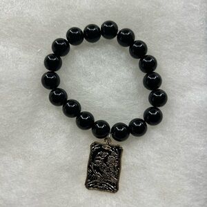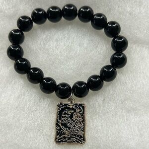 Elevate your accessory game with this striking black 12mm Onyx bracelet featuring a detailed gold metallic charm. The charm showcases a raven perched beside a flower under a crescent moon/star – a beautiful combination of gothic, spiritual, and bohemian symbolism. (Unisex bracelet)