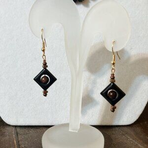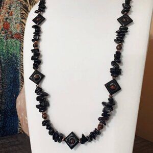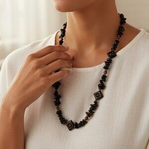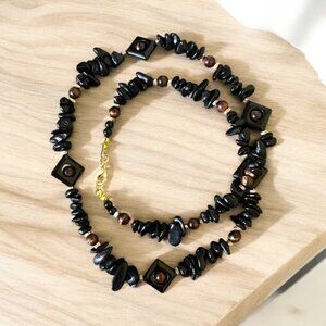 This 22" necklace set features black onyx square beads, with chocolate brown moonstone gemstones in the center, and natural black agate stone chips, accented with warm copper accent beads.