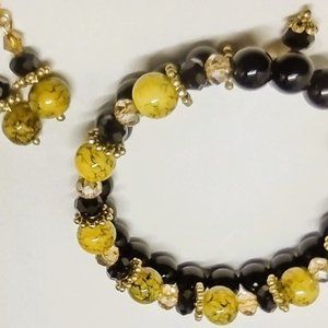 Black Onyx, Spider Agate, Amber and Gold Accent 2 Row Memory Wire Bracelet