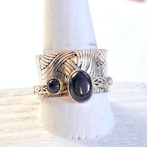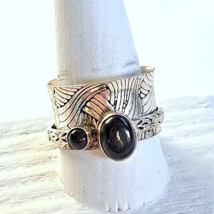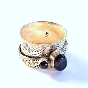 This spinner features a single thin spinner band holding two beautiful, polished bezel-set black onyx gemstones. This band spins freely over the main wide band. The bands have contrasting textured patterns. The main band is ½” wide and slightly flared.