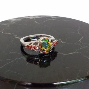 - The 0.9 carat black opal cabochon measures 7x9 mm oval