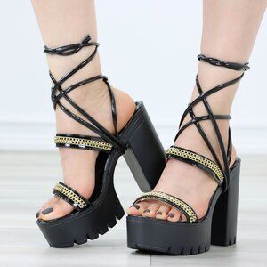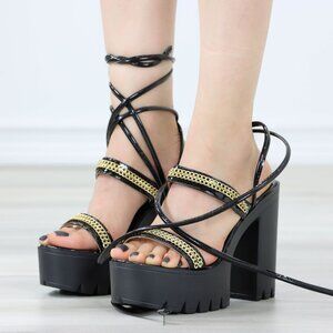 Black Open Toe Block Chunky High Heel Sandals Gold Chain Ankle Strap Ties Laces