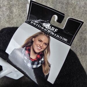 This set includes a sheer black open-front cardigan featuring a stylish lightweight knit texture and three-quarter sleeves. Paired perfectly with a fashionable blue and black plaid infinity scarf, it enhances versatility for layering. Made with soft polyester, this combination is both comfortable and chic. One size fits most.