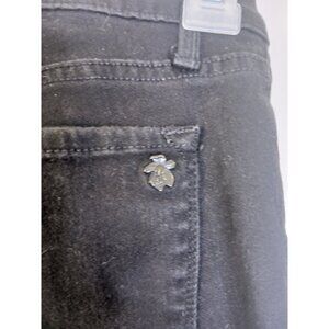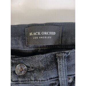 The Black Orchard NOAH Ankle Fray Black Denim Jeans in women's size 28x26 are a stylish and versatile addition to any wardrobe. Made from a durable blend of spandex and cotton, these slim-fit jeans feature a dark fabric wash and a solid black color. The mid-rise waist and ankle length make them perfect for a variety of seasons, while the button and zip closure adds a classic touch. With accents like a logo and pockets for added convenience, these jeans combine comfort and style for a fashion-forward look. Whether you're going for a grunge or gothic-inspired vibe, these jeans are sure to make a statement. (CC)