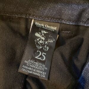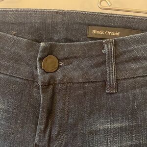 Take your denim look up a level! These Black Orchid Los Angeles Dark Navy mid rise jeans have a skinny fit through the knee and a flared leg opening. Comes in a dark blue wash. Sits at the natural waistline. Two slide hip pockets, plus 2 button pockets on the back. Zip fly with button closure. Women's size 25. Dress these up or dress them down! Excellent pre-owned condition, no flaws. Measurements in photos.