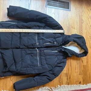 Excellent condition. Down coat from Orolay. Size M. Length: 28". Pit to pit: 21". Attached hood. Lots of zippers. Hood is white fleece lined. The rest of coat is lined in orange fabric.