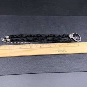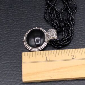 Black Oval Pendant Necklace Multi Strand Glass Seed Beads Antiqued Silver Tone