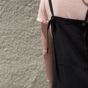 +straight, midi cut overall inspired dress+features side slits and pockets+ 60% tencel, 40%cotton+ made in Los Angeles