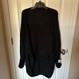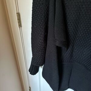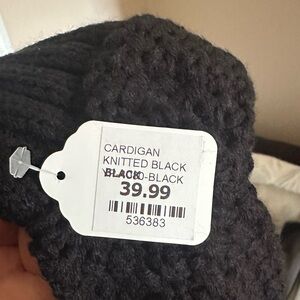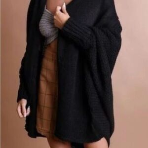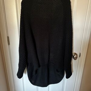 This cozy black cardigan features a relaxed, oversized fit with long sleeves and a tunic-like length, perfect for keeping warm in style.
