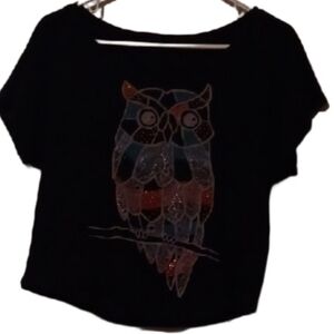 Stylish black t-shirt featuring a colorful owl graphic. Perfect for casual wear.