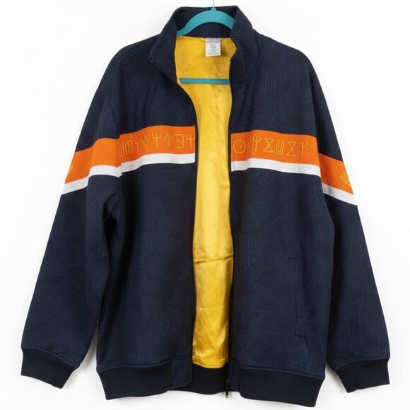 Bold Marvel windbreaker with striking orange accents. Features unique design elements. Ideal for casual wear. Jacket ia black with purple accents and orange , yellow and white trim. Has embroidery on the sleeves with the black panther logo. Great for any Marvel lover, great gift for anyone traveling on the Disney Dianey Marvel Heroa and Villians cruise. Great way to stay fresh and in style. Size XL. New with tags.