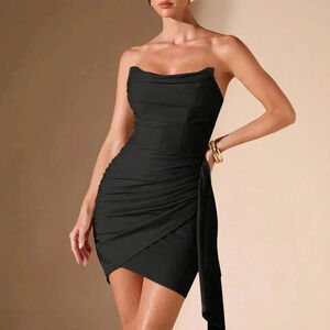 Black Party Women's Apricot Strapless Ruched Side Wrap Hem Shiny Bodycon Dress
