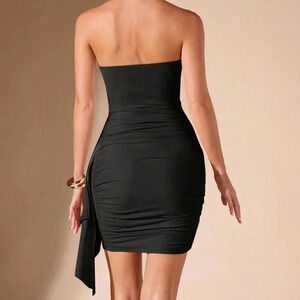 Black Party Women's Apricot Strapless Ruched Side Wrap Hem Shiny Bodycon Dress