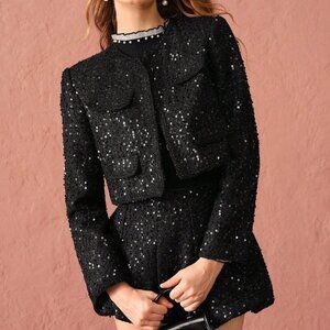 Black Party Women's Romantic Elegant Sequin Cropped Sparkling Tweed Jacket