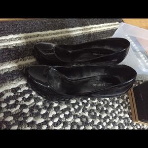 Worn condition. Womens size 7 black leather pumps with 4 inch heel platform has some scruff marks