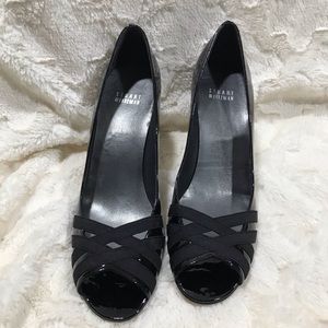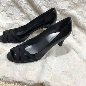 Black patent with a peep toe. The criss cross straps are stretchy. In excellent pristine condition. Size 9 N