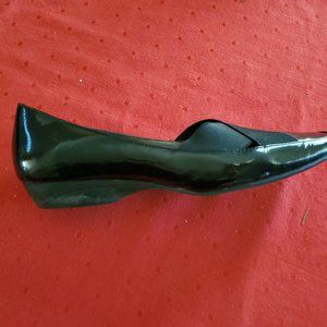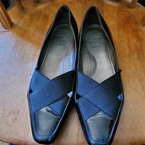 Very comfortable shoes for dress. 8 1/2M. Black patent with a stretchy criss-cross in the front (slight ripple on one side). Very little wear to these shoes. Pet free, smoke free home.