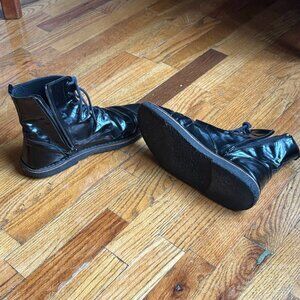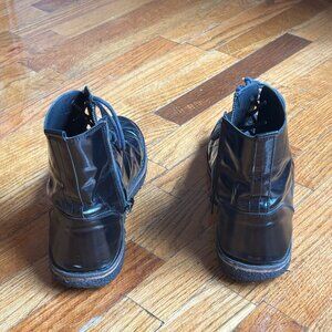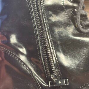 Zip up patent leather black boots from Italian sneaker company Golden Goose Deluxe Brand. Nicely broken in. Crepe sole. You're not going to find these anywhere else. Zipper star and insole photos show the brand.